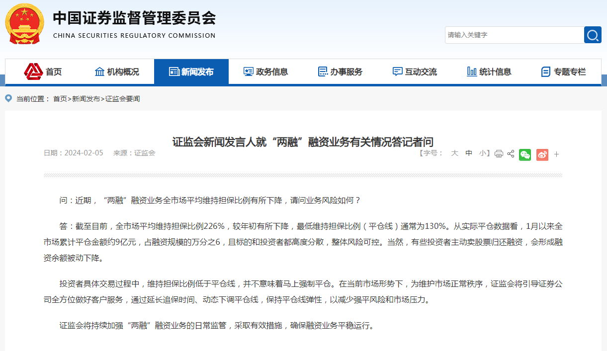 证监会将持续加强“两融”融资业务的日常监管,采取有效措施,确保融资业务平稳运行。