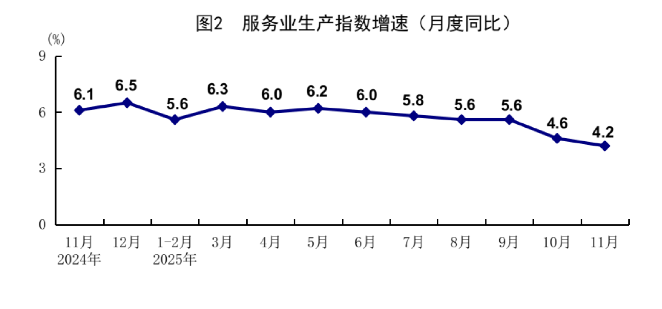 11月份,全国服务业生产指数同比增长4.2%。分行业看,信息传输、软件和信息技术服务业,租赁和商务服务业,金融业生产指数同比分别增长12.9%、8.4%、5.1%,分别快于服务业生产指数8.7、4.2、0.9个百分点。1-11月份,全国服务业生产指数同比增长5.6%。1-10月份,规模以上服务业企业营业收入同比增长7.6%。11月份,服务业商务活动指数为49.5%,服务业业务活动预期指数为55.9%。其中,铁路运输、电信广播电视及卫星传输服务、货币金融服务等行业商务活动指数位于55.0%以上较高景气区间。