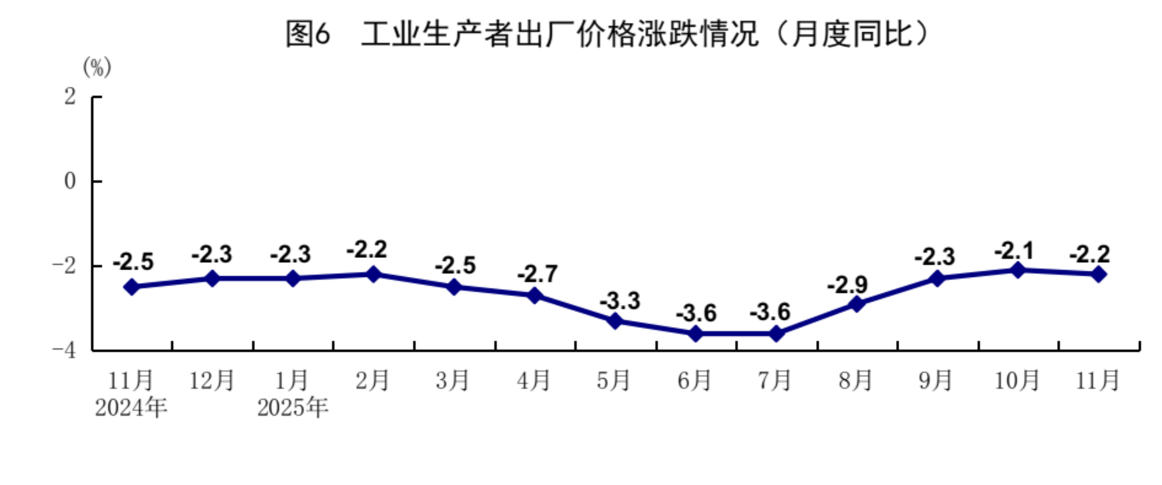 11月份,全国工业生产者出厂价格同比下降2.2%,环比上涨0.1%;全国工业生产者购进价格同比下降2.5%,环比上涨0.1%。1-11月份,全国工业生产者出厂价格和购进价格同比分别下降2.7%、3.1%。