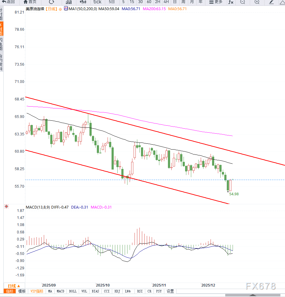 周四亚盘时段,国际原油价格延续昨日强势反弹势态,交投于56.70美元/桶附近,目前技术层面依然处于超跌反弹区间之内,尚未出现明确的趋势转向。 尽管价格企稳反弹,但受北美假期及年末因素影响,市场整体交投依旧清淡,资金入场意愿有限。 本轮反弹的主要驱动,来自美国在地缘政治层面的强硬表态。