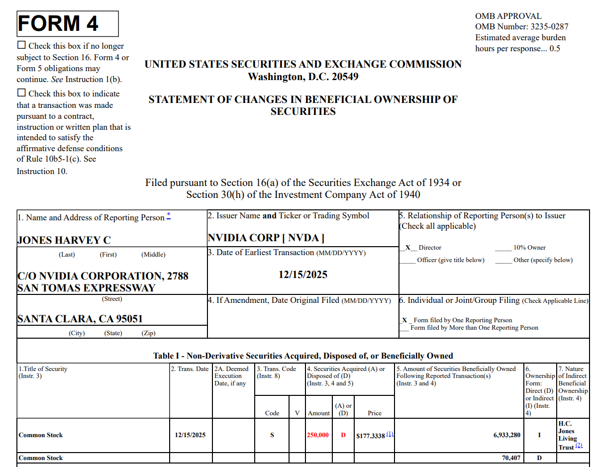 该文件显示,琼斯于12月15日出售了25万股股票,平均每股售价为 177.33 美元。自1993年公司成立以来,哈维·琼斯就一直担任英伟达的独立董事。
