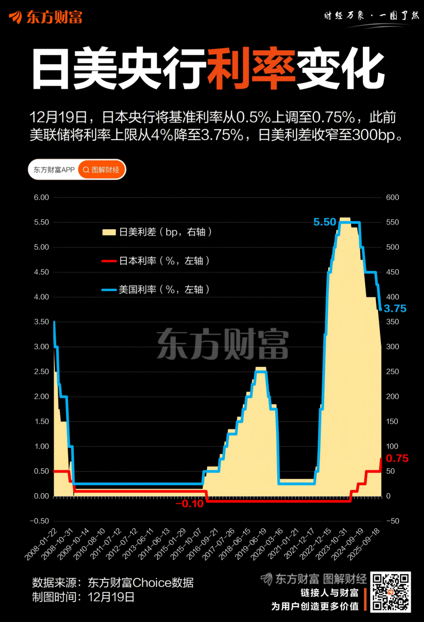 为了应对日元持续疲软和国内通胀日益顽固,12月19日,日本央行宣布加息25bp,将基准利率从0.5%上调至0.75%。这是日本央行自2025年初上调25bp以来的再次加息,研究机构普遍认为,这或许标志着日本的“宽松时代”告一段落。