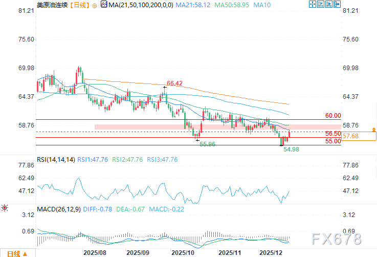 周一(12月22日)美盘时段,受美国与委内瑞拉紧张局势升级的影响,地缘政治风险溢价小幅注入油市,WTI原油(WTI)价格小幅走高。美国原油基准价盘中报约57.70美元,日内涨幅近2%,在上周末触及年内低点后延续反弹态势。