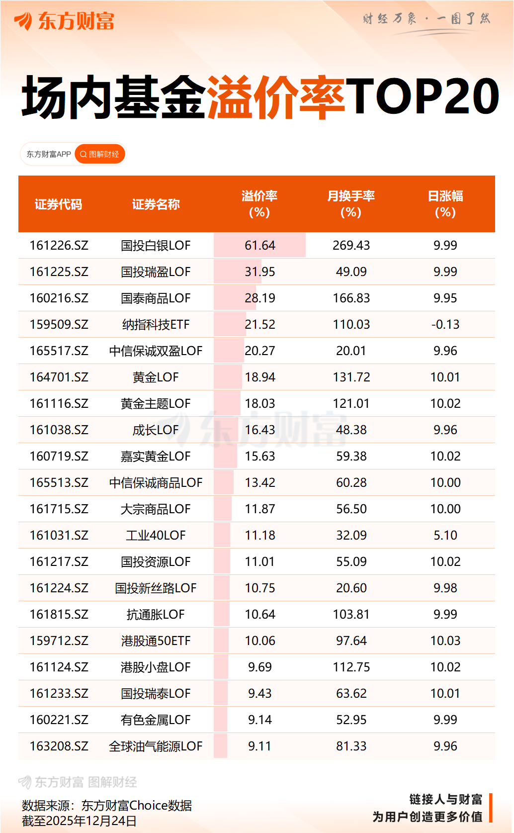 截至12月24日收盘,包括国投瑞银白银LOF、国投瑞银中证上游LOF、嘉实黄金QDII-FOF-LOF、易方达黄金主题A人民币LOF等20余只LOF在二级市场涨停。