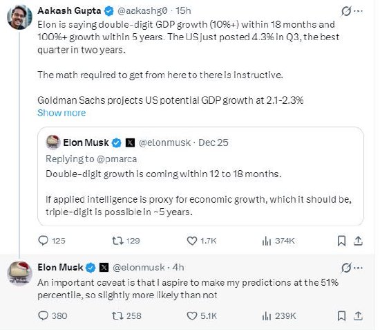 这位网友写道:“华尔街的预测(2%的增长)和马斯克的预测(100%以上的增长)之间的差距,就是‘AI是一个有用的工具’和‘AI自动化了一切’之间的差距。两者都可以是内部一致的。问题是你相信哪种AI的发展模式。