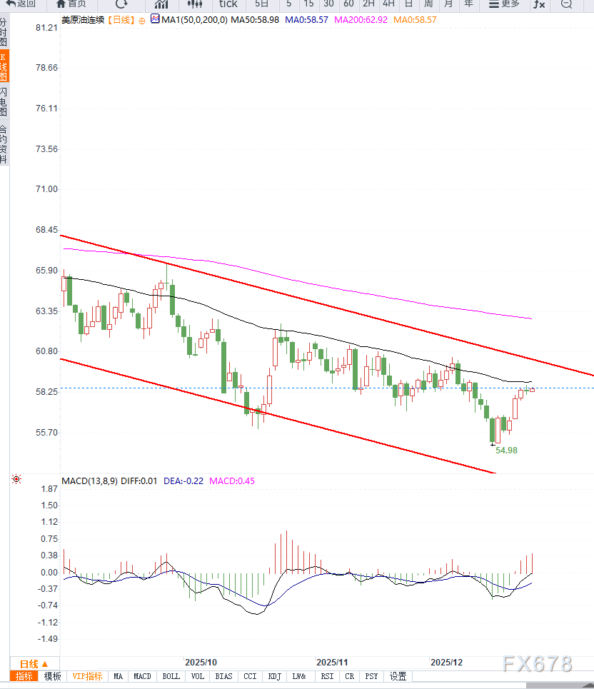 今年以来,国际油价在需求疲软、供应扩张和地缘政治缓和预期的多重作用下持续走低,累计跌幅约20%,并一度刷新2021年以来低点。随着新增产能集中释放,2026年前后全球原油市场或进入“超级过剩”阶段,库存持续累积将进一步压制油价。从技术面看,美原油日线仍处于明显下行通道,反弹动能不足。尽管围绕能源与关键矿产的地缘博弈仍存,但短期内难以扭转油价偏弱运行的整体格局。