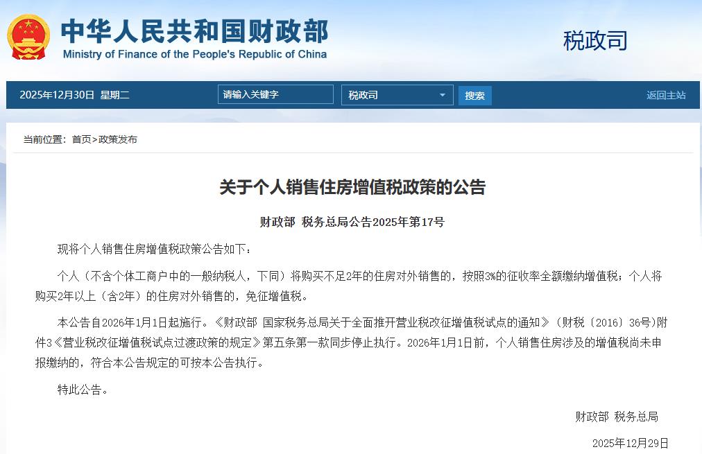 本公告自2026年1月1日起施行。《财政部国家税务总局关于全面推开营业税改征增值税试点的通知》(财税〔2016〕36号)附件3《营业税改征增值税试点过渡政策的规定》第五条第一款同步停止执行。2026年1月1日前,个人销售住房涉及的增值税尚未申报缴纳的,符合本公告规定的可按本公告执行。