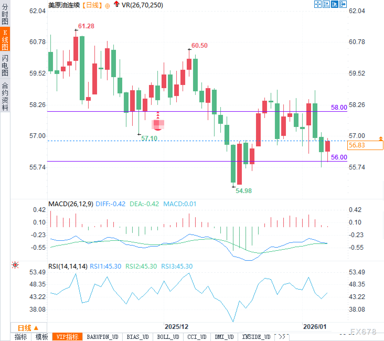 指标层面,MACD(26,12,9)显示DIFF为-0.42、DEA为-0.42,柱状图约0.01,意味着下行动能虽明显衰减、但趋势尚未完成强势反转确认;RSI(14)在45.30附近,处于弱势区间但并未进入极端超卖,符合“反弹后回撤、再选择方向”的震荡特征。整体而言,技术结构更偏向箱体整理:58.00不被有效突破前,上行多以技术性反弹和回测为主;56.00若被反复测试且量能无法配合企稳,短线的下破风险会被放大。