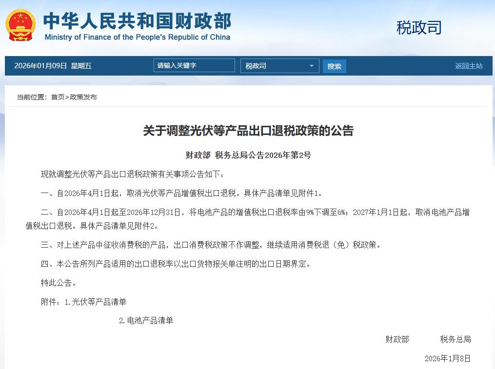 一、自2026年4月1日起,取消光伏等产品增值税出口退税。具体产品清单见附件1。