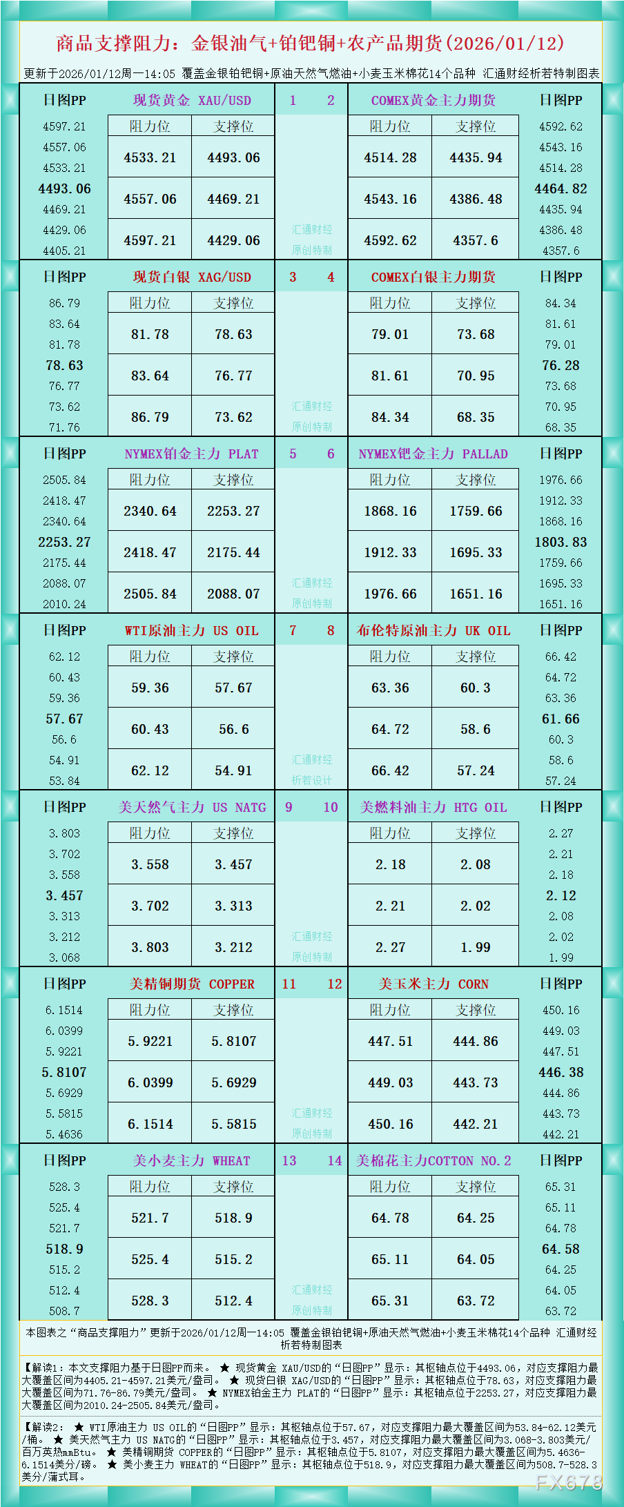 一张图看商品支撑阻力:金银油气+铂钯铜+农产品期货,更新于2026年1月12日周一14:05,具体覆盖金银铂钯铜+原油天然气燃油+小麦玉米棉花14个品种,更多详见汇通财经析若特制图表中的内容。