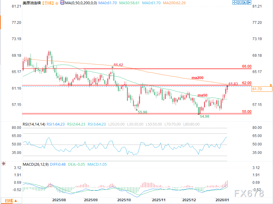 WTI原油价格因担心伊朗抗议活动可能扩散并扰乱生产或霍尔木兹海峡而大幅上涨。然而,更大范围的基本面和全球供应过剩缓和了上行风险。当前接近62美元的水平是关键分界线:若油价突破62美元阻力位,可能为进一步涨向66美元附近的六个月高点打开道路。