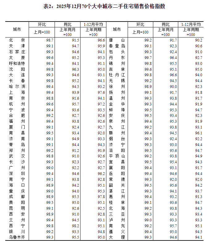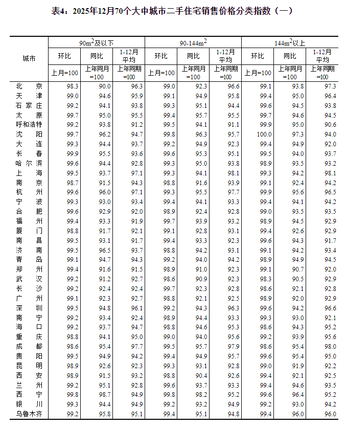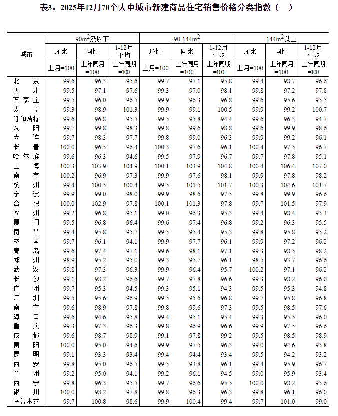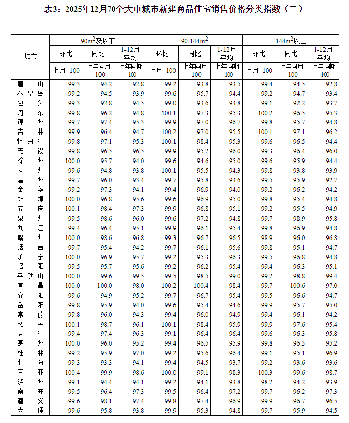 2025年12月份70个大中城市商品住宅销售价格变动情况