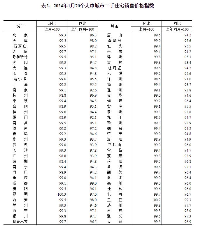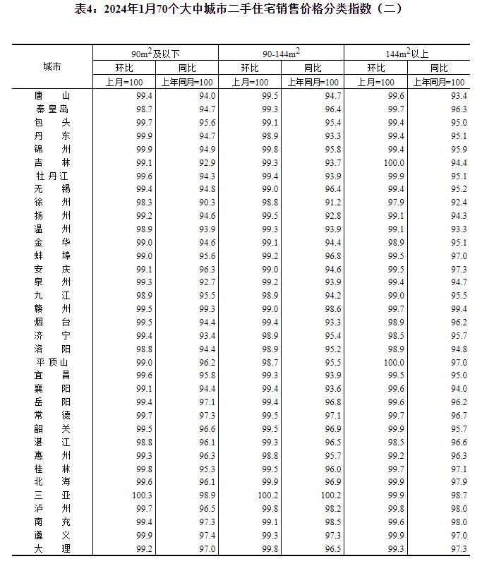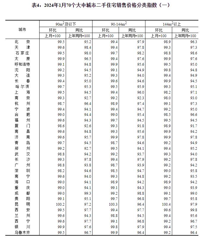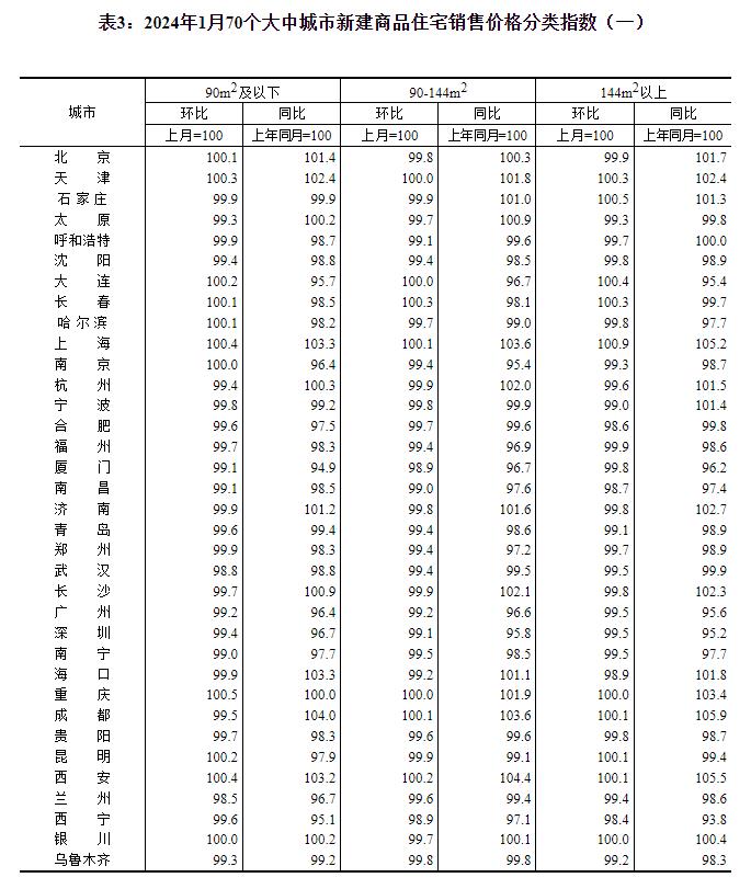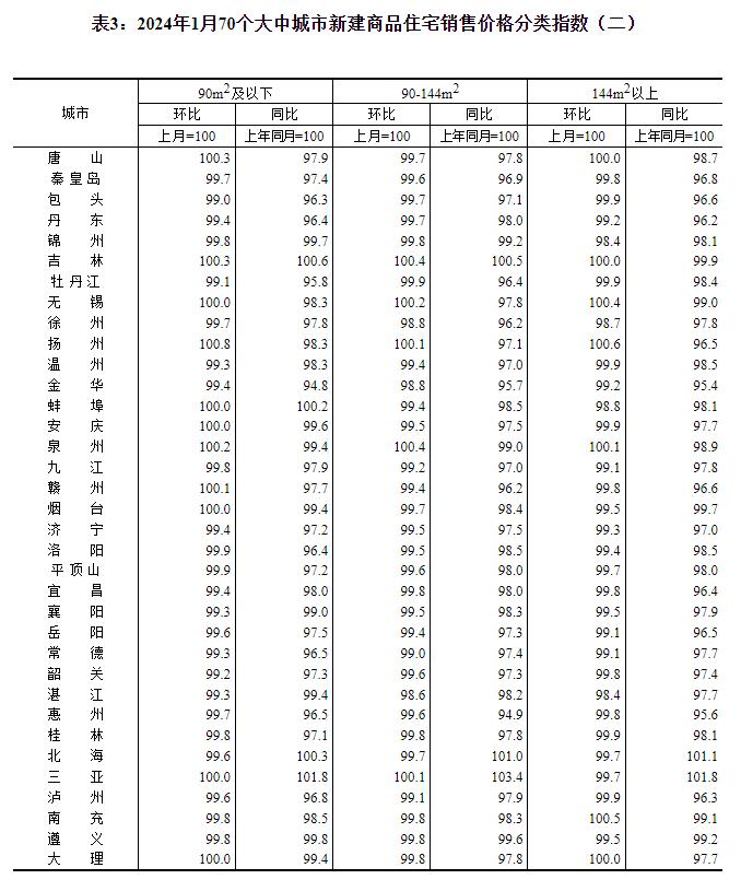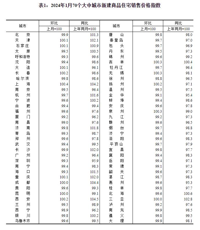 2024年1月份70个大中城市商品住宅销售价格变动情况