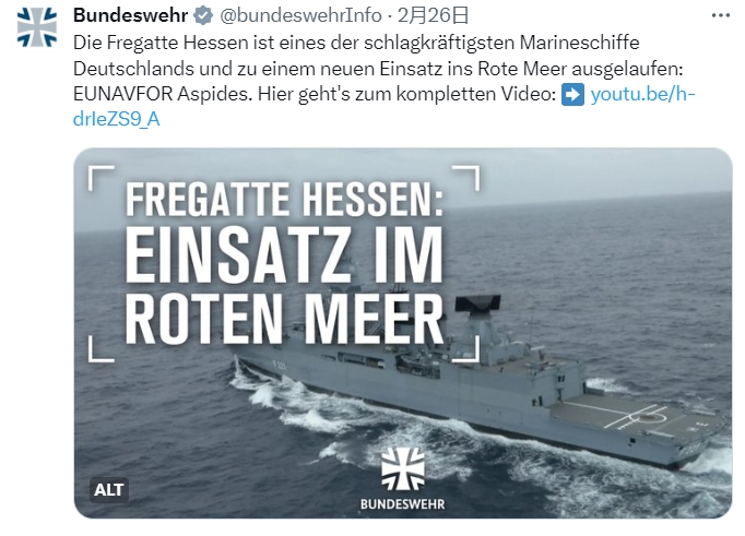 根据安排,黑森号将于欧盟护航编队一同运作,并在红海呆到4月底。后续轮换的部队则要连续运转4个月。