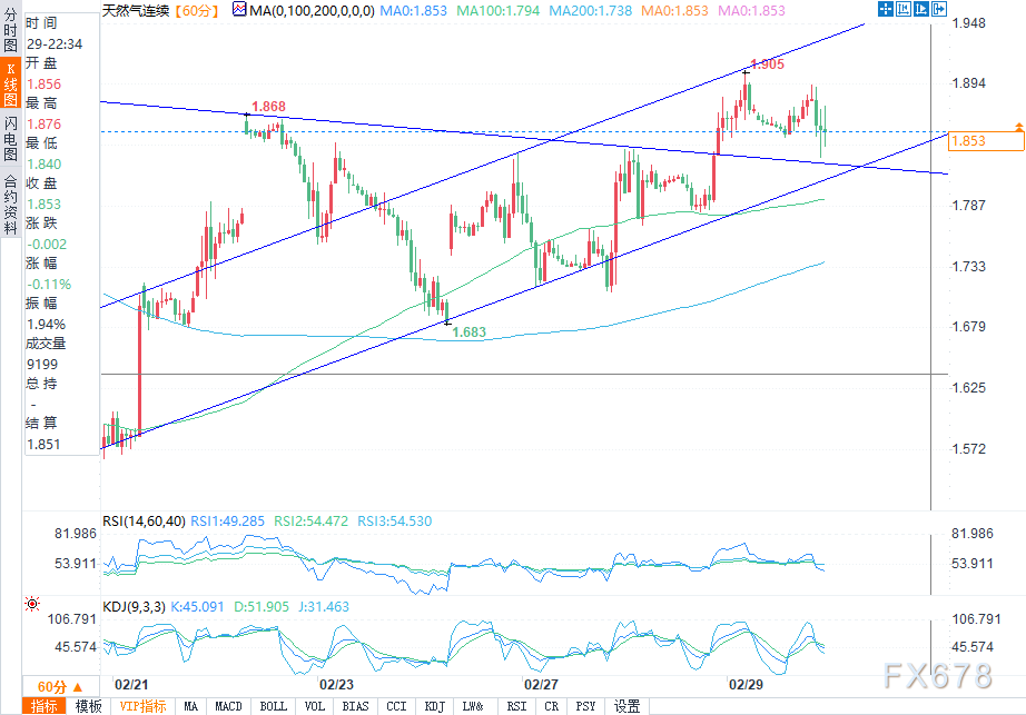 天然气价格在1小时时间框架内仍然呈上升趋势,从上升通道的支撑位反弹。价格可能从这里开始瞄准通道顶部1.900美元,尽管技术指标看起来好坏参半。