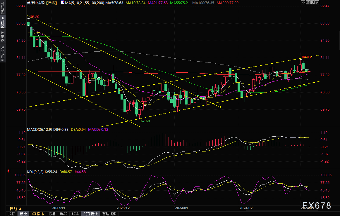 周三(3月6日)亚洲时段,美原油窄幅震荡,目前交投于78.19美元/桶附近,勉强收涨200日均线77.99上方。油价周二下跌近1%,因市场对亚洲大国能否实现经济增长目标持怀疑态度,投资者风险偏好下降,美元走软。 布伦特原油期货周二收低0.76美元,或0.9%,报每桶82.04美元;美国原油期货回落0.59美元,或0.8%,收报每桶78.15美元。这两大指标原油盘中均下跌超过1美元。