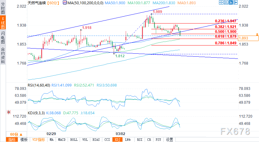 在1小时图中,天然气处于修正模式,价格跌破了通道支撑。价格正跌向61.8%回撤位1.87美元的水平,该水平和100期移动平均线对齐。