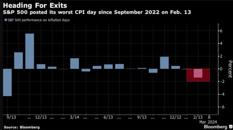 美国劳工部当时公布的数据显示,美国1月核心消费者价格环比涨幅创下8个月来最大,这导致标普500指数当天下跌了1.4%——这是该指数自2022年9月以来最糟糕的CPI发布日表现。2月份的那次大跌,也将美债收益率推至了年内的最高点。