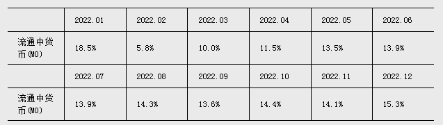 注4:自2022年12月起,“流通中货币(M0)”含流通中数字人民币。12月末流通中数字人民币余额为136.1亿元。修订后,2022年各月末M1、M2增速无明显变化。修订后M0增速如下: