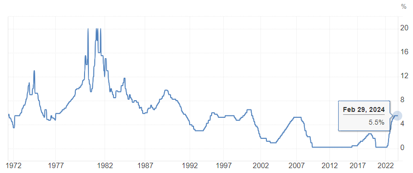 2022年3月,美联储进入了快速加息周期并完成了11次加息,累计加息幅度高达525个基点,联邦基金利率也从0%-0.25%上升至5.25%-5.50%,达到了22年来的最高水平并一直持续到了现在。