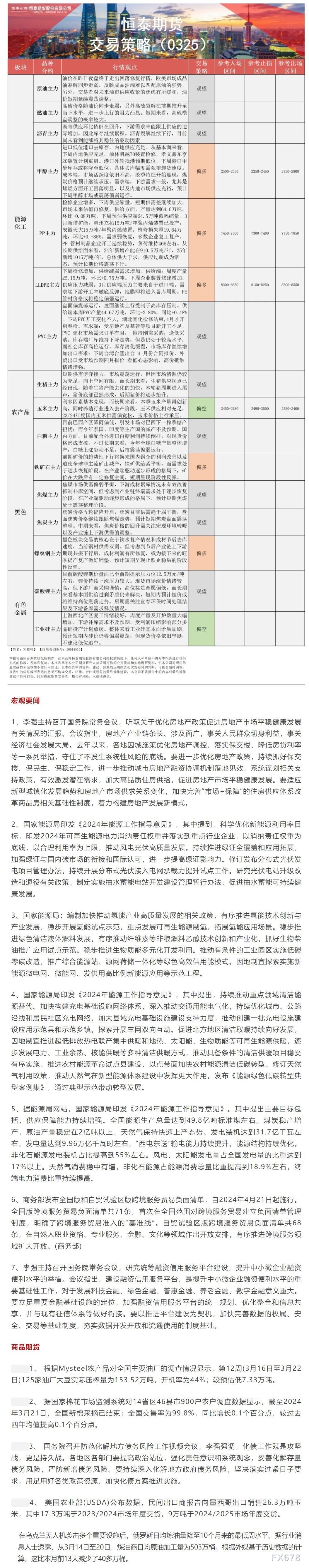 以下是恒泰期货今日早间交易策略,覆盖品种有:宏观分析、原油沥青甲醇燃料油等能源化工、玉米白糖生猪等农产品、黑色系如铁矿石焦煤焦炭螺纹钢、有色系如工业硅碳酸锂等。