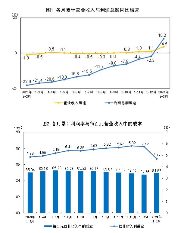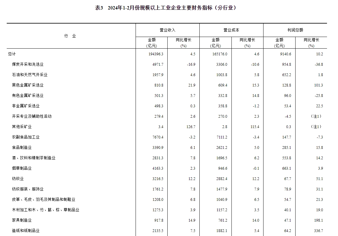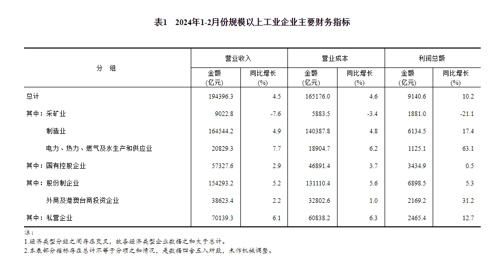 1—2月份,全国规模以上工业企业实现利润总额9140.6亿元,同比增长10.2%(按可比口径计算,详见附注二)。