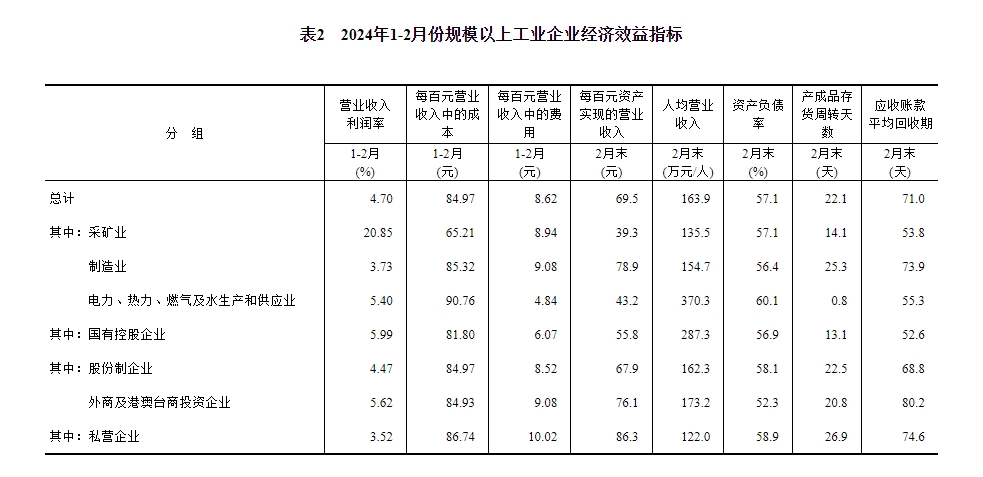 1—2月份,规模以上工业企业实现营业收入19.44万亿元,同比增长4.5%;发生营业成本16.52万亿元,增长4.6%;营业收入利润率为4.70%,同比提高0.24个百分点。