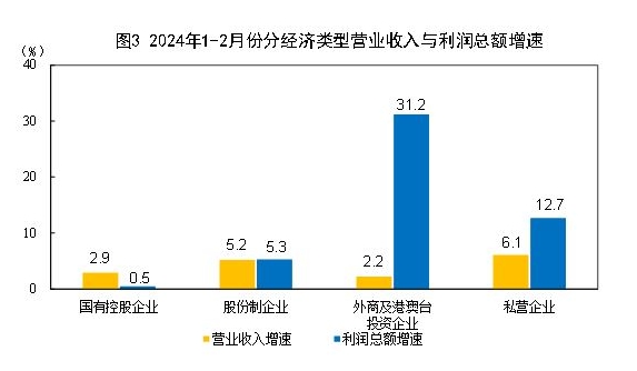 1—2月份,规模以上工业企业中,国有控股企业实现利润总额3434.9亿元,同比增长0.5%;股份制企业实现利润总额6898.5亿元,增长5.3%;外商及港澳台投资企业实现利润总额2169.2亿元,增长31.2%;私营企业实现利润总额2465.4亿元,增长12.7%。
