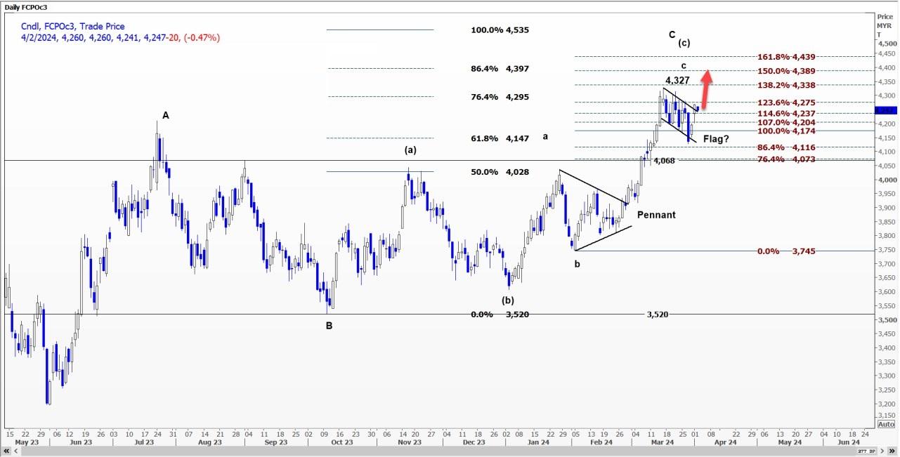 技术面看,FCPOc3合约从3月15日高点4327林吉特的回调可能已经完成。从3月27日低点4128林吉特的强劲上涨进一步表明上升趋势的恢复。