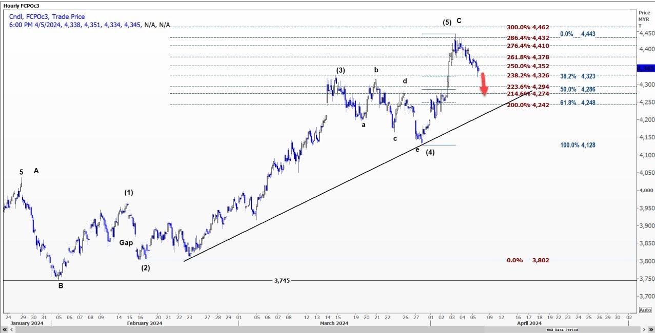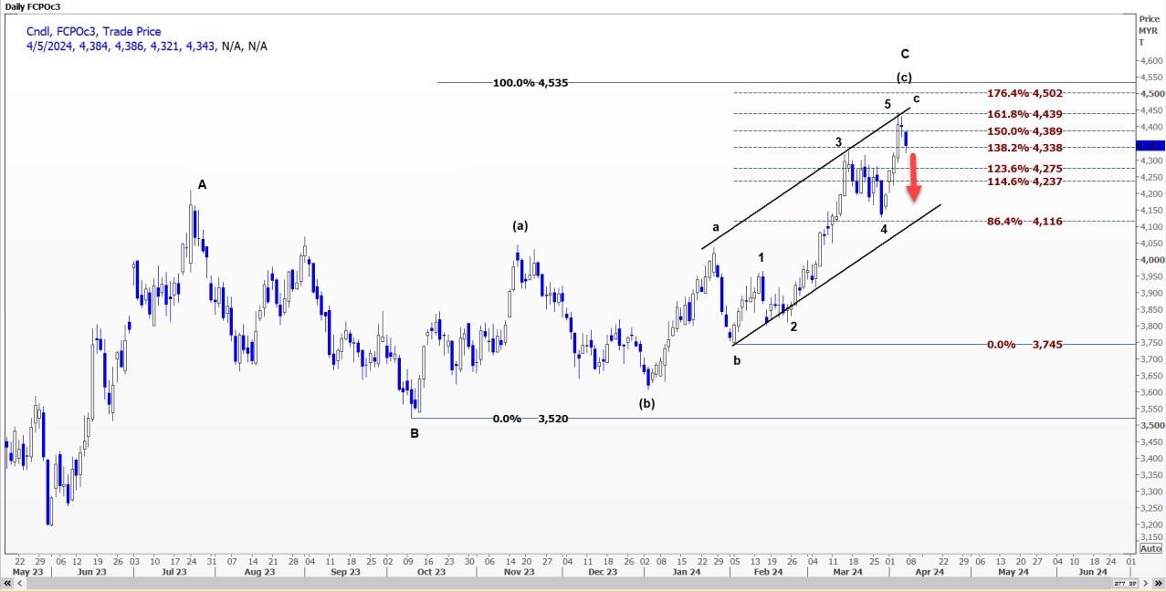 马来西亚棕榈油期货周一连续第三天下跌,此前上周创下年内新高,原因是竞争对手大豆油的下跌引发获利回吐。技术面看,马棕榈油可能进一步跌至4274-4294林吉特区间。