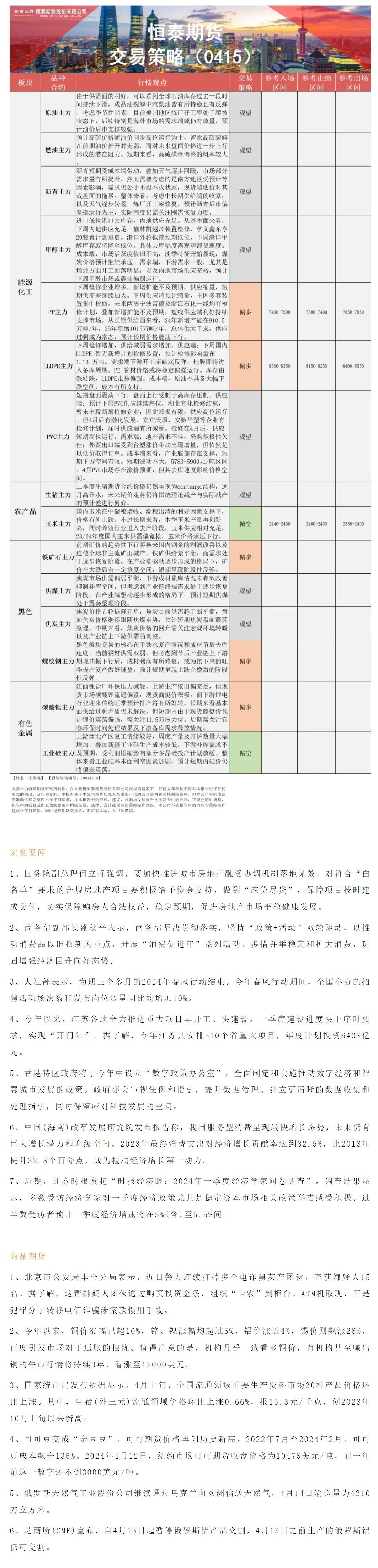 以下是恒泰期货今日早间交易策略,覆盖品种有:宏观分析、原油燃料油等能源化工、玉米生猪等农产品、黑色系如铁矿石焦煤焦炭螺纹钢、有色系如工业硅碳酸锂等。