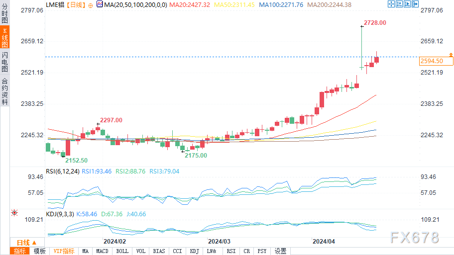 自2月份以来,LME三个月期铝价一直呈上升趋势。4月18日收于一年多来的最高点,为每吨2597美元/吨,涨幅1.05%。