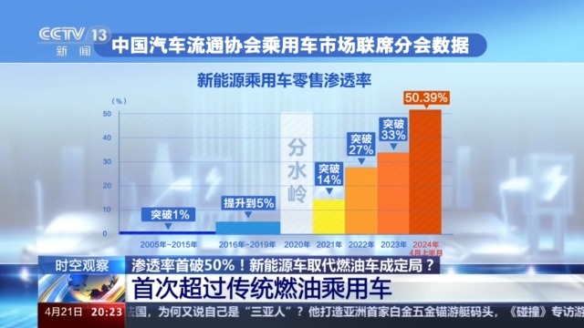 据该协会的乘用车市场联席分会的数据显示,4月1日至14日,我国新能源乘用车市场零售26万辆,同比增长32%,4月上半月,新能源乘用车零售渗透率为50.39%,首次超过传统燃油乘用车。