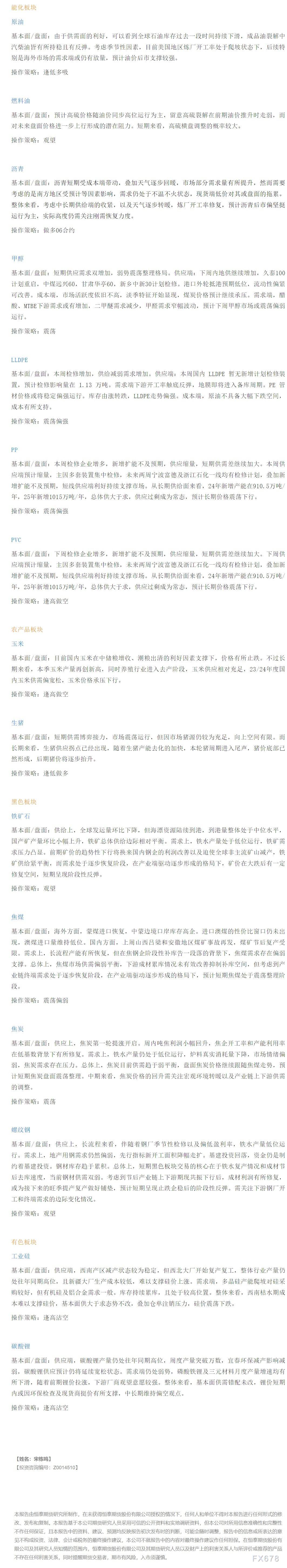 以下是恒泰期货今日早间交易策略,覆盖品种有:宏观分析、原油燃料油等能源化工、玉米生猪等农产品、黑色系如铁矿石焦煤焦炭螺纹钢、有色系如工业硅碳酸锂等。