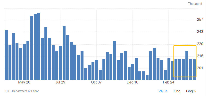 通常情况下,这份初请报告的关注度并不像非农、职位空缺等数据来得那样高,但分析师很快发现了不对劲的地方,就是这项数据在近六周有五周录得21.2万人,唯一有变化的一周是3月30日,为22.2万人。