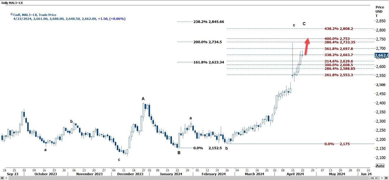 金价正处于C浪中,4月15日,C浪一度突破其361.8%预测水平2735美元。随着市场再次接近这一水平,C浪可能会恢复至2808美元。