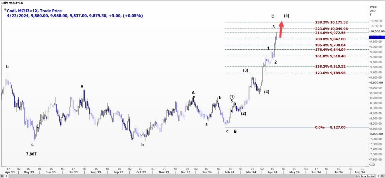 受延伸波(5)的推动,伦敦金属交易所(LME)铜本周可能攀升至每公吨10176美元。