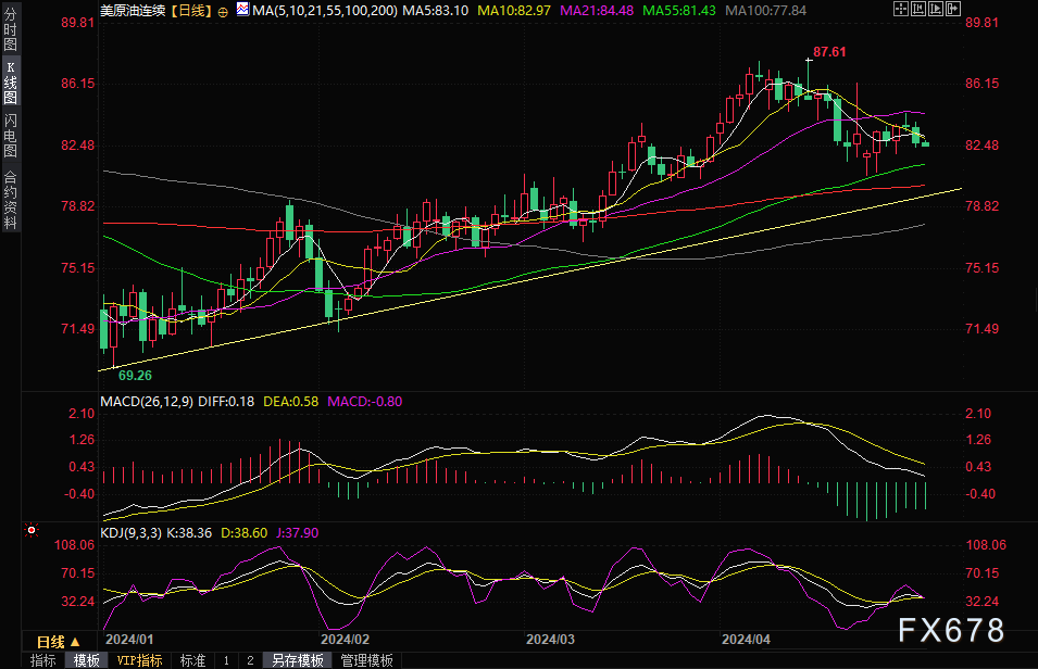 油价周一下跌超过1美元,在开罗举行的以色列和哈马斯停火谈判缓解了人们对中东冲突扩大的担忧,而美国通胀数据打击了即将降息的前景,短线油价面临进一步下行风险,美原油或试探55日均线81.43附近支撑。