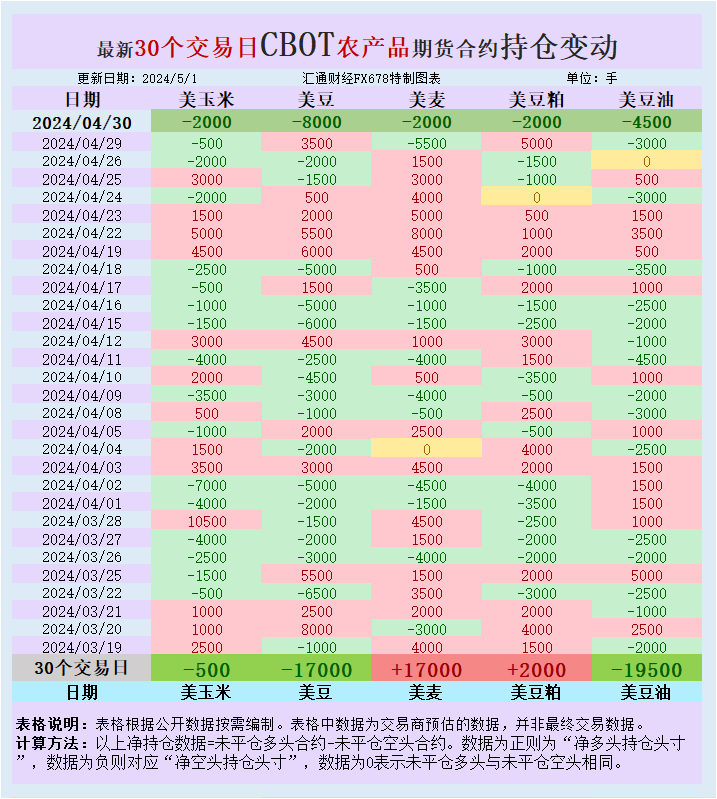 本周二(4月30日),大宗商品基金增加CBOT美豆、美豆粕、美玉米、美麦、美豆油投机性净空头。包括金属和原油在内的大宗商品普遍疲软,加剧了谷物市场的负面人气。