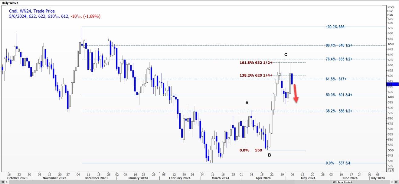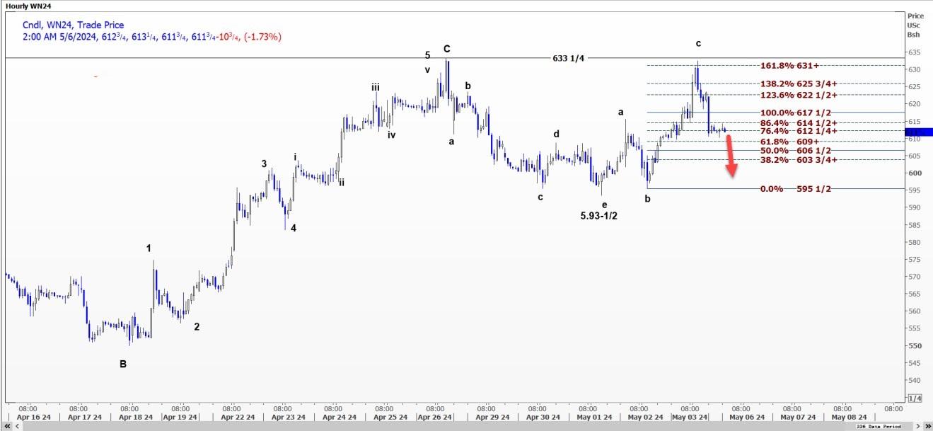 芝加哥期货交易所7月小麦WN24期货可能跌向每蒲式耳5.9550美元,因为从该水平的反弹已经完成。