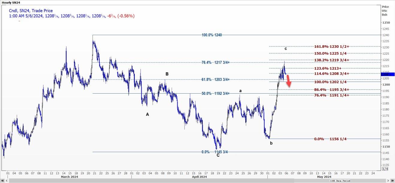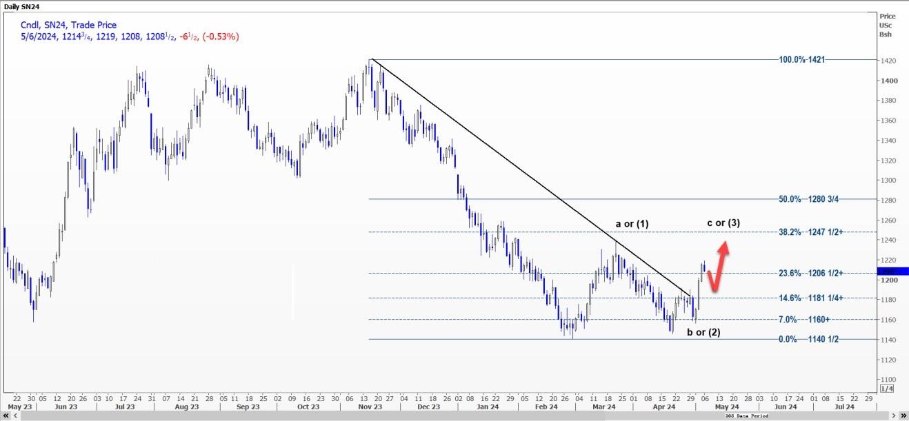 芝加哥期货交易所(CBOT)大豆7月合约SN24可能测试每蒲式耳12.0225-12.0375美元的支撑区域,因为未能突破12.1975美元的阻力位。