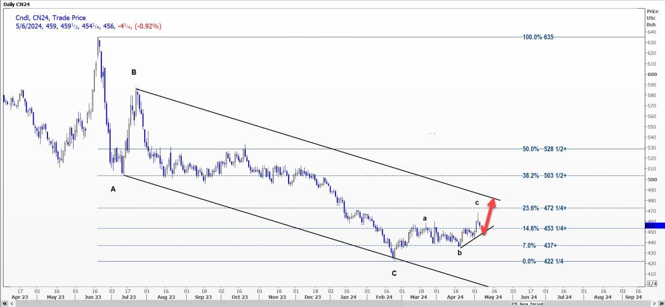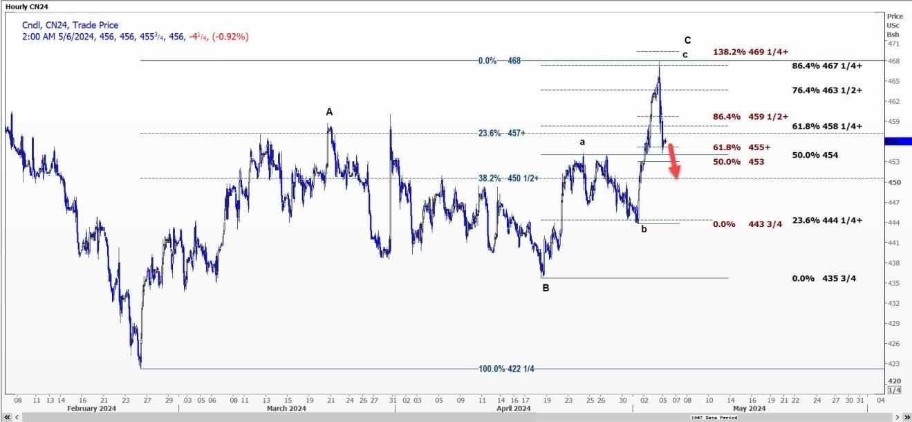 回撤分析显示,芝加哥期货交易所7月玉米CN24可能进一步下跌至每蒲式耳4.5050美元。