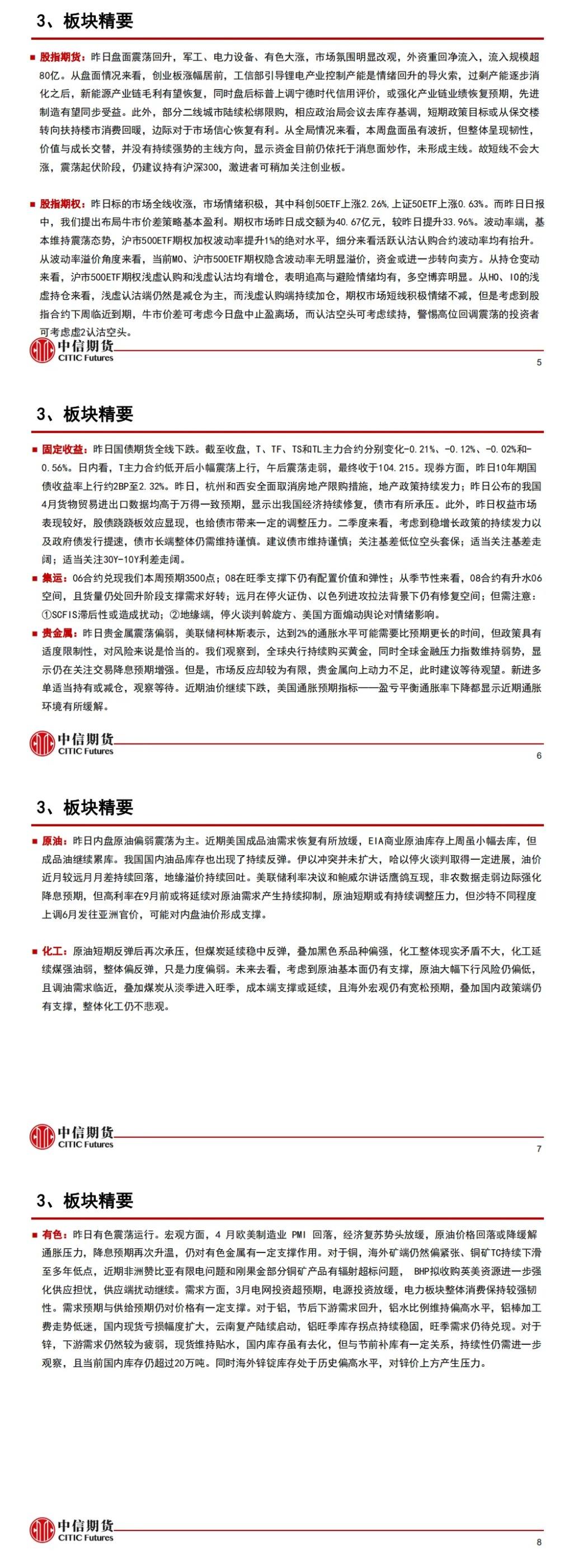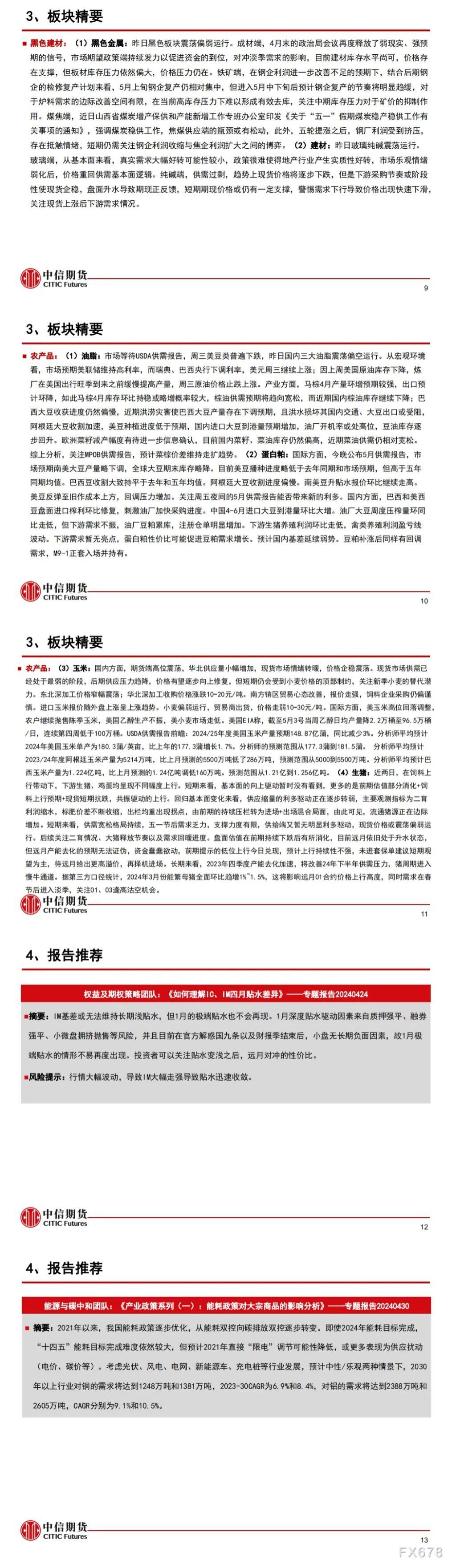 以下为中信期货今日晨报对股指、国债、贵金属、原油能源化工、有色金属、螺纹钢材焦炭黑色系玻璃纯碱等建材、玉米生猪油脂蛋白粕等农产品等期货的操作建议和提醒。