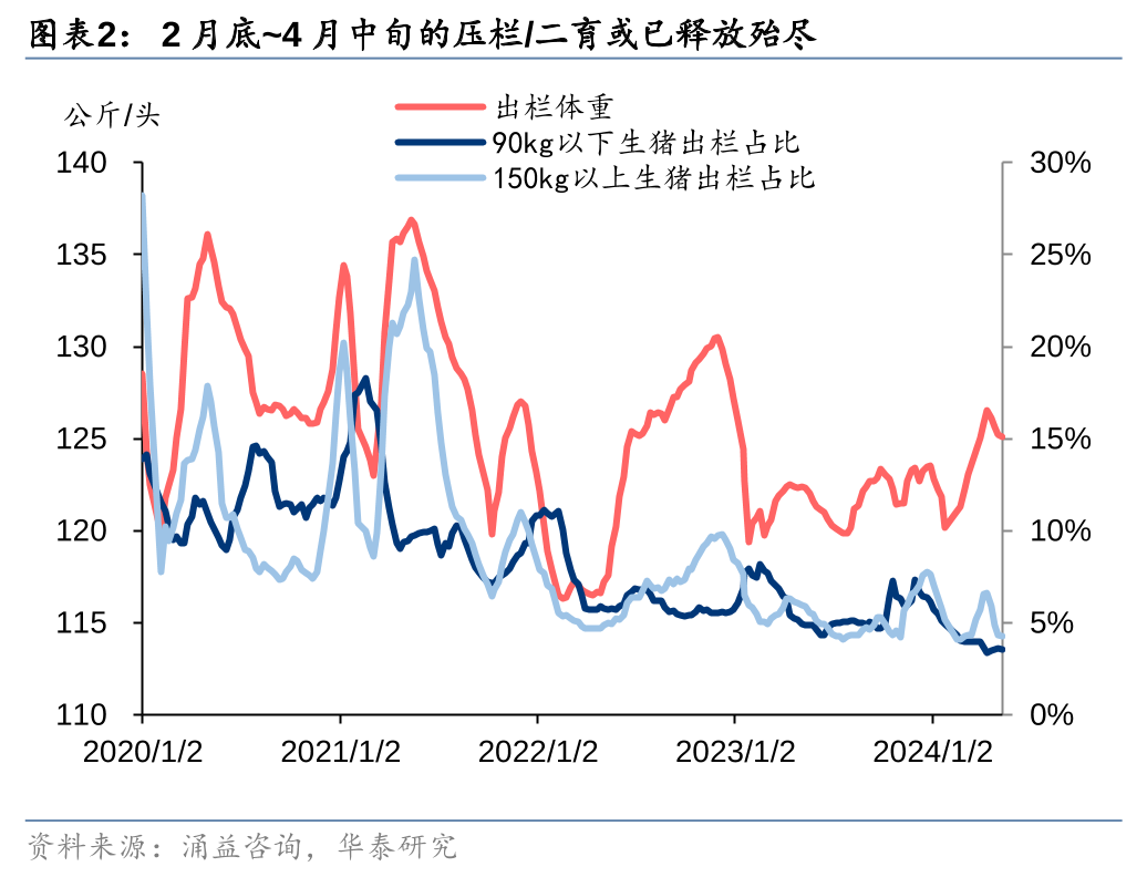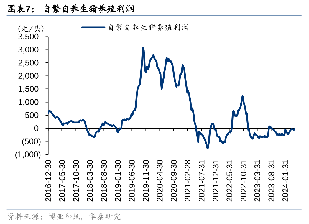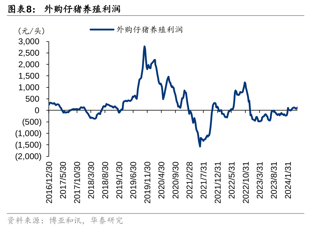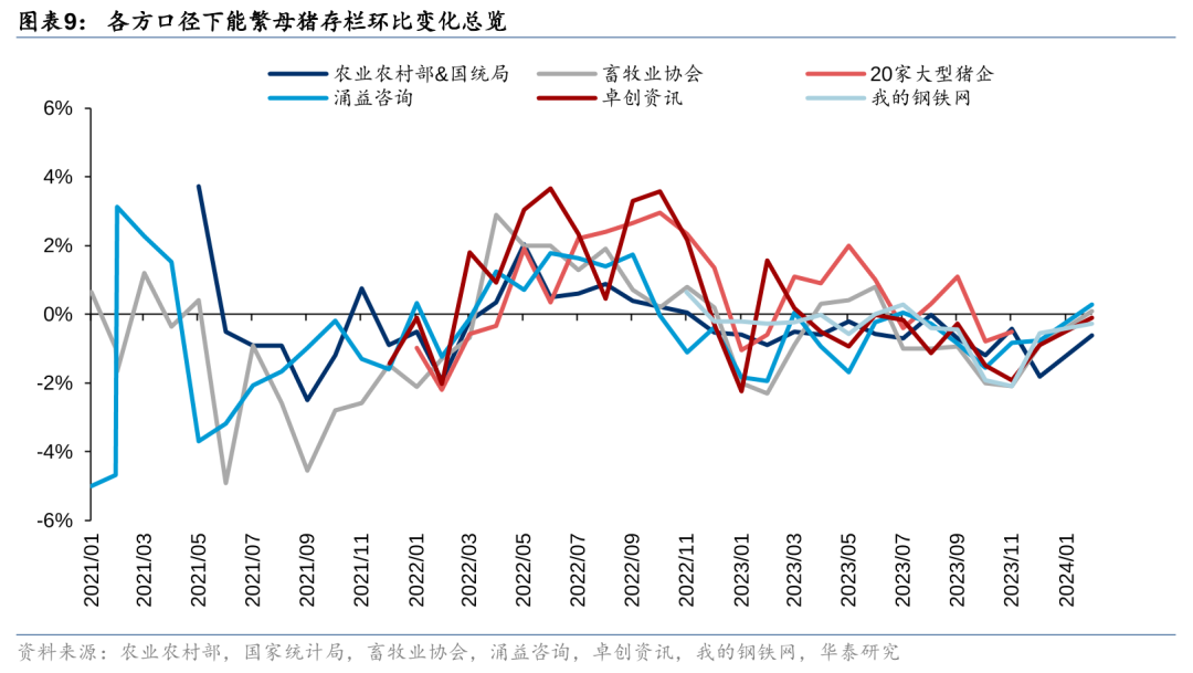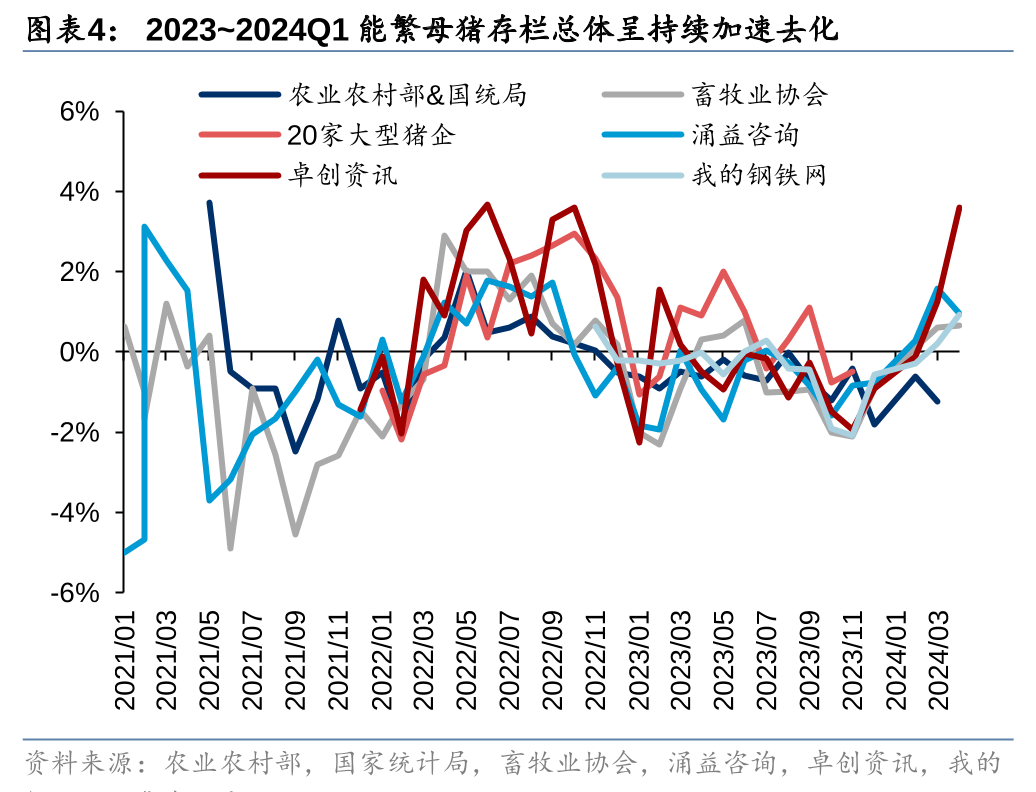 官方口径24Q1能繁母猪存栏加速去化,短期猪价回暖或不改产能去化趋势。农业农村部&国家统计局(官方)监测24Q1末全国能繁母猪存栏3992万头、环比-3.6%(23Q4末环比-2.3%)。此前发布的第三方监测2月能繁母猪存栏数据环比变化存在一定分歧,如我的钢铁网、卓创资讯监测能繁母猪存栏环比仍在去化,畜牧业协会、涌益咨询监测能繁母猪存栏则出现了短期的环比转正,导致市场担忧肥猪、仔猪价格上涨会导致本轮周期能繁母猪去化进程结束。我们认为,周期底部的现金流压力加剧才是母猪产能去化背后的核心,短期猪价反弹不改长期亏损背景下养殖端现金流压力加剧的现状,或难改能繁母猪产能去化进程。