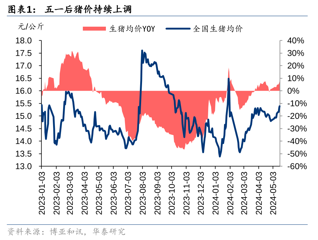 猪价加速上涨,短中期涨价支撑仍足。近期猪价持续上调,从五一节前的14.8元/公斤左右上涨至5月17日的15.4元/公斤左右。且周末猪价上涨加速,涌益监测周末生猪均价上涨约0.38元/公斤、截至5月19日全国生猪均价约15.8元/公斤,多地猪价突破16元/公斤。我们分析,近期猪价上涨主要得益于前期能繁母猪产能去化带来的商品猪供应逐步收缩、叠加每年5月起猪肉消费逐步转旺,以及前期压栏/二育的生猪出栏压力或已释放殆尽而新的压栏/二育群体正观望逐步进场。展望后市,短期来看,后市猪价乐观预期叠加饲料原料成本低位运行背景下压栏/二育或持续进场,猪价托底支撑仍足;中期来看,2023年~2024Q1国内能繁母猪存栏持续加速去化、或带动2024年生猪供应压力逐季缓解,猪肉消费逐步进入传统旺季,供需格局持续偏紧或驱动猪价易涨难跌。
