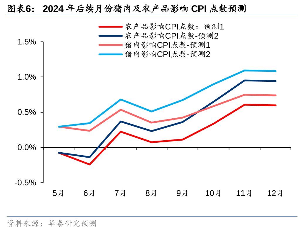 华泰证券指出,短期压栏/二育或持续进场形成有力托底,中期供需格局持续偏紧或驱动猪价易涨难跌。同时,4月CPI同比涨幅扩大,猪肉贡献由负转正。预计今年后续月份猪肉价格或持续同比上涨,相应带动猪肉价格对CPI持续正向贡献。按照2024年月度生猪价格高点在18元/公斤和20元/公斤左右测算,猪肉价格高点时影响CPI的点数或在0.75%~1.1%左右。