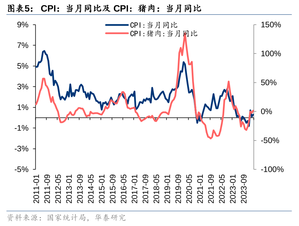 4月CPI同比涨幅扩大,猪肉贡献由负转正。4月CPI同比上涨0.3%、同比涨幅比上月扩大0.2个百分点,其中猪肉价格由上月的下跌2.4%转为上涨1.4%。展望后市,我们预计今年后续月份猪肉价格或持续同比上涨,相应带动猪肉价格对CPI持续正向贡献。我们分别按照2024年月度生猪价格高点在18元/公斤和20元/公斤左右测算,猪肉价格高点时影响CPI的点数或在0.75%~1.1%左右。考虑到猪价持续上涨或带动股价、猪肉涨价拉动cpi或催生的通胀预期、母猪存栏短期难以修复或带动猪价超预期机会,建议积极布局生猪养殖板块。