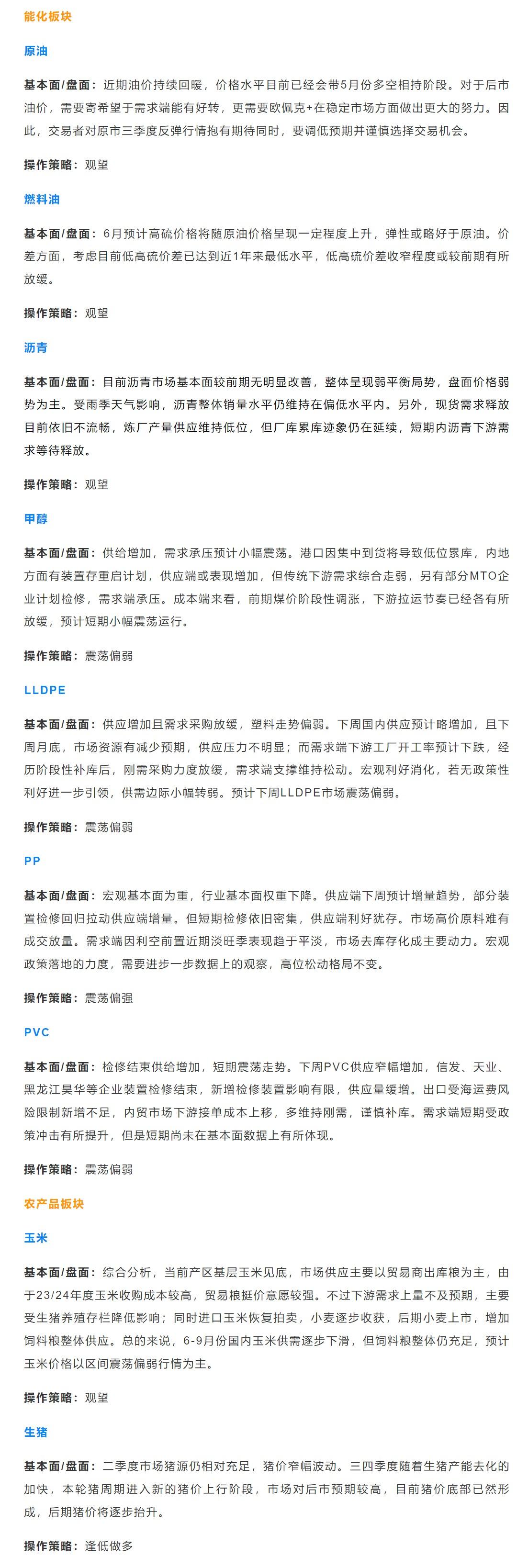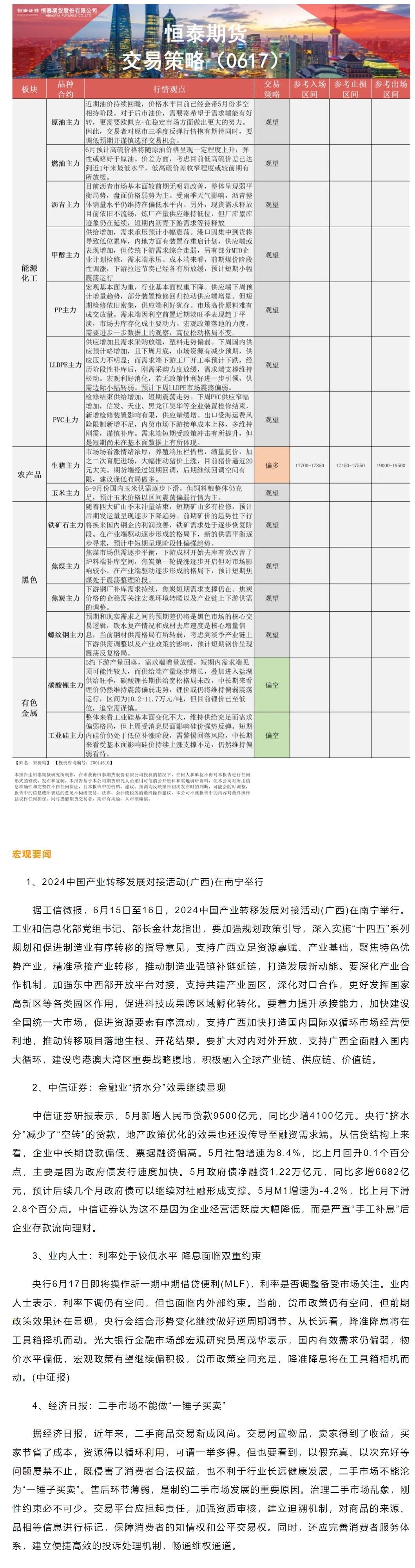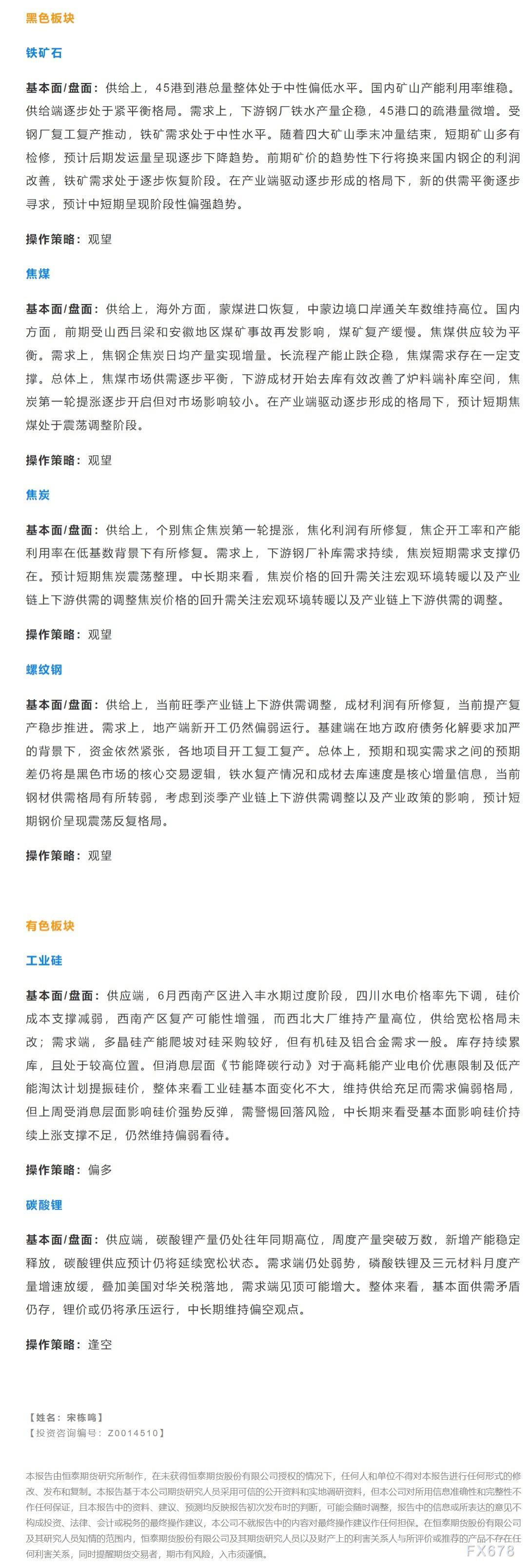 以下是恒泰期货今日早间交易策略,覆盖品种有:宏观分析、原油燃料油等能源化工、玉米生猪等农产品、黑色系如铁矿石焦煤焦炭螺纹钢、有色系如工业硅碳酸锂等。