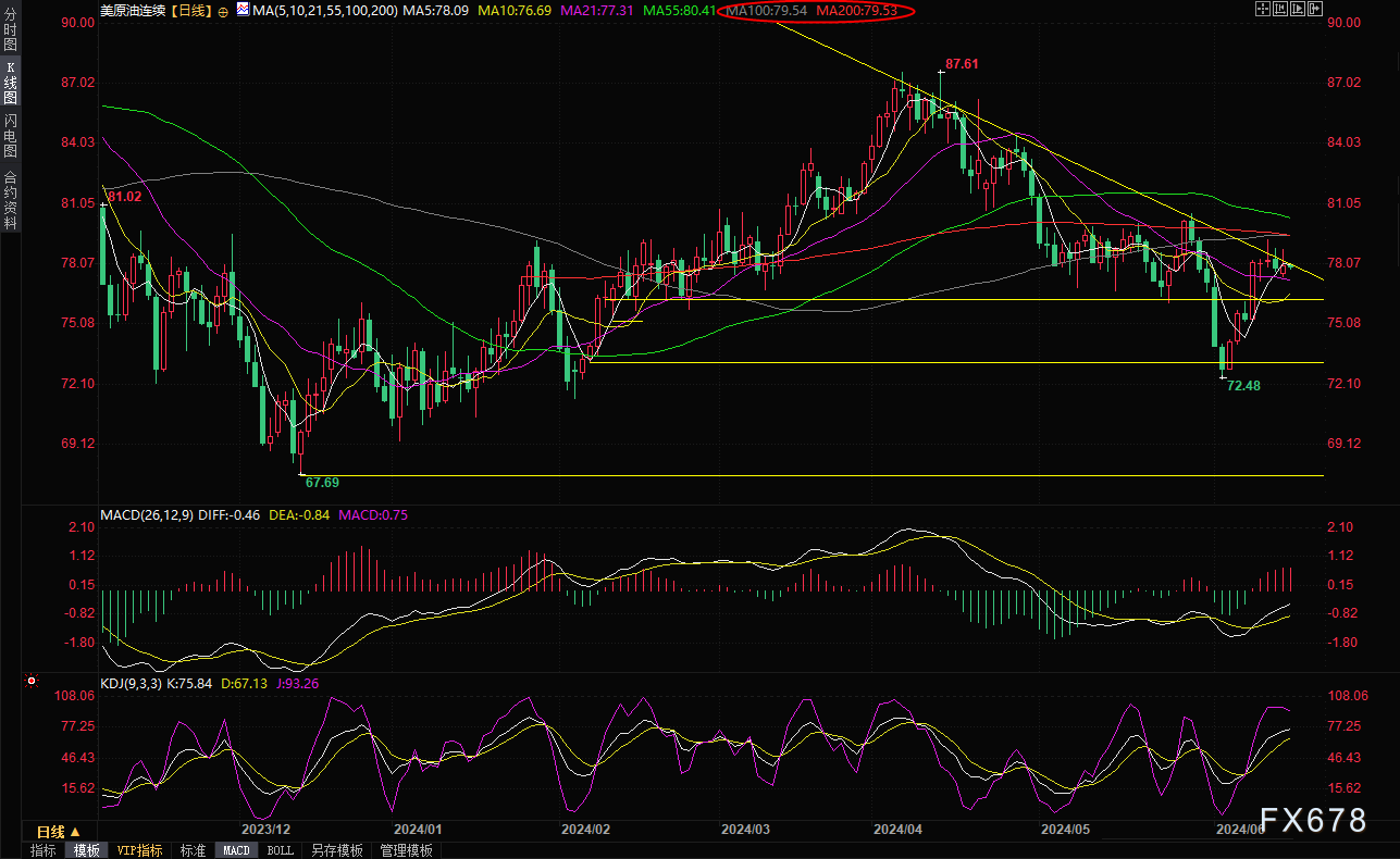 周一(6月17日)亚市早盘,国际油价窄幅震荡,美原油目前交投于77.93美元/桶,石油期货周五小幅收低,此前一项调查显示美国消费者信心恶化,但油价周线上涨4%,投资者评估2024年原油和燃料需求稳健的预测。 布伦特原油期货上周五收跌0.13美元,结算价报每桶82.62美元;美国原油期货上周五收跌0.17美元,报78.54美元。 两大指标上周均上涨近4%,创4月以来最大周线涨幅。但仍受到200日均线和100日均线的双重阻力位压制。
