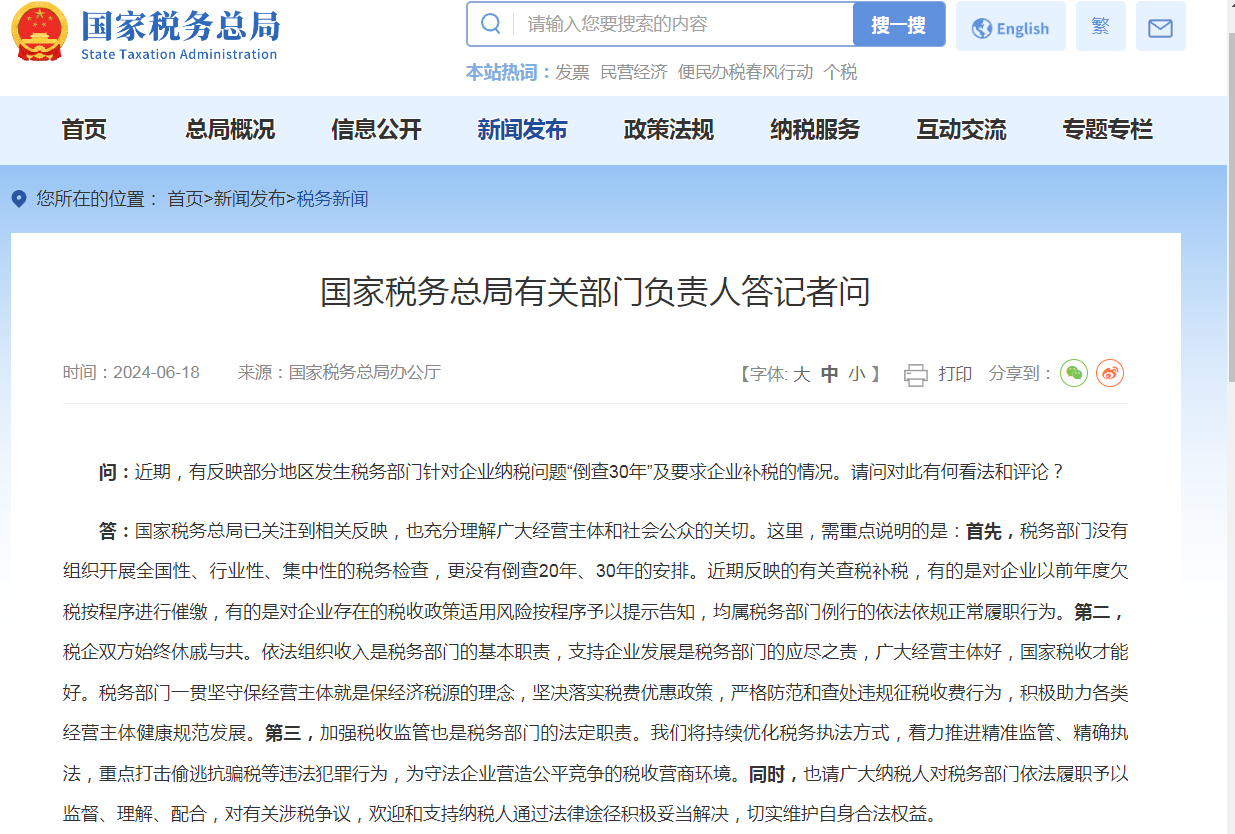 问:近期,有反映部分地区发生税务部门针对企业纳税问题“倒查30年”及要求企业补税的情况。请问对此有何看法和评论?